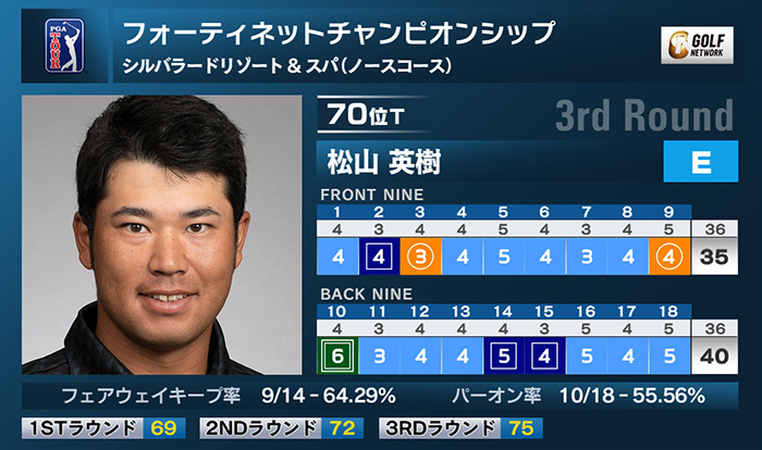 米男子ツアーの2022-23年シーズン開幕戦、フォーティネットチャンピオンシップは17日、米カリフォルニア州のシルバラートリゾート&スパ(7,123ヤード・パー72)で第3ラウンドが行われ、松山英樹は2バーディ、3ボギー、1ダブルボギーの「75」と落とし、通算イーブンパー70位タイに後退した。