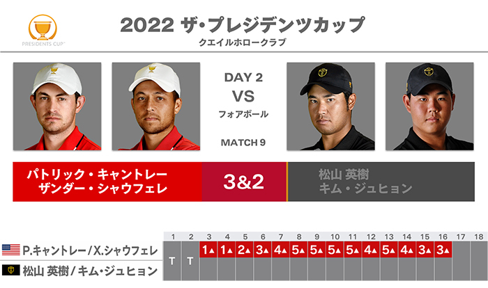 23日、ザ・プレジデンツカップ(米ノースカロライナ州/クエール・ホローC)は2日目の競技を終えた。この日はフォアボール(2人がそれぞれ自分のボールでプレーし、ホールごとに良いほうのスコアを採用)で行われ、松山英樹&キム・ジュヒョンはパトリック・キャントレー&ザンダー・シャウフェレに3&2で敗れた。