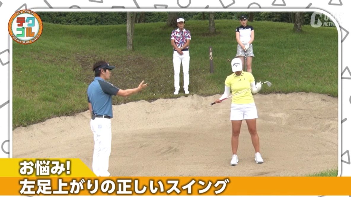 なお、今回お話しした対処法は、平らな地面に対して肩のラインを水平に保てるケースでのみ有効です。極端な左足上がり、左足下がりで、左足重心や右足重心ができなくなる場合は、対処法が変わってくるのでご注意ください。