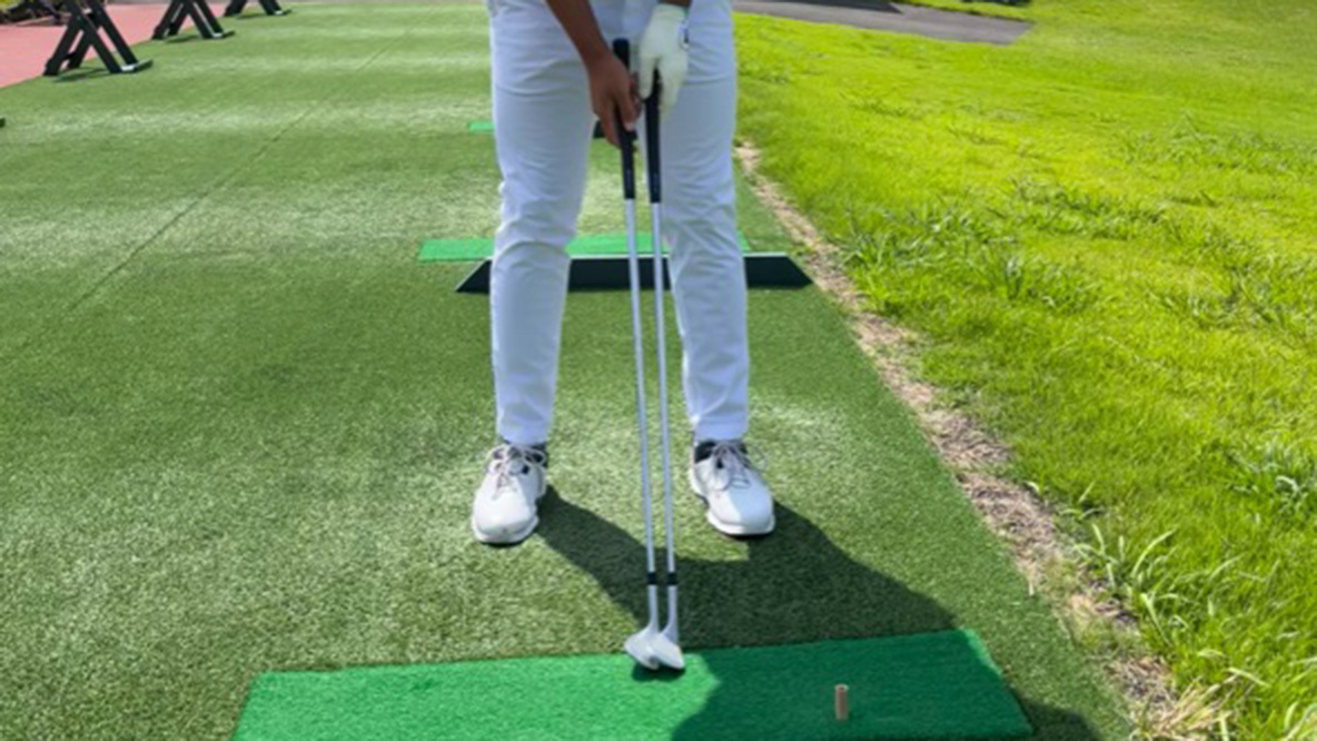 僕は、ドライバーの2倍前後の重さがあるスイング練習用のバットを振っていますが、そういうものがなければ、アイアン2本を持ってやってもOK(写真①)。とにかく重いものをビュンビュン振ってください。この練習をやることで下半身の正しい使い方も自然と身につくので、飛距離アップだけでなく、スイング矯正にも役立つと思います。