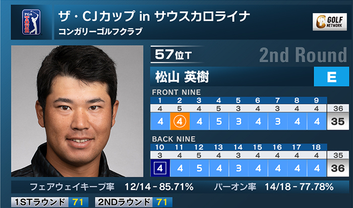 米男子ツアーのザ・CJカップ in サウスカロライナは21日、米サウスカロライナ州のコンガリーゴルフクラブ(7,655ヤード・パー71)で第2ラウンドが行われ、松山英樹は1バーディ、1ボギーの「71」とスコアを伸ばせず、通算イーブンパー57位タイで終えた。