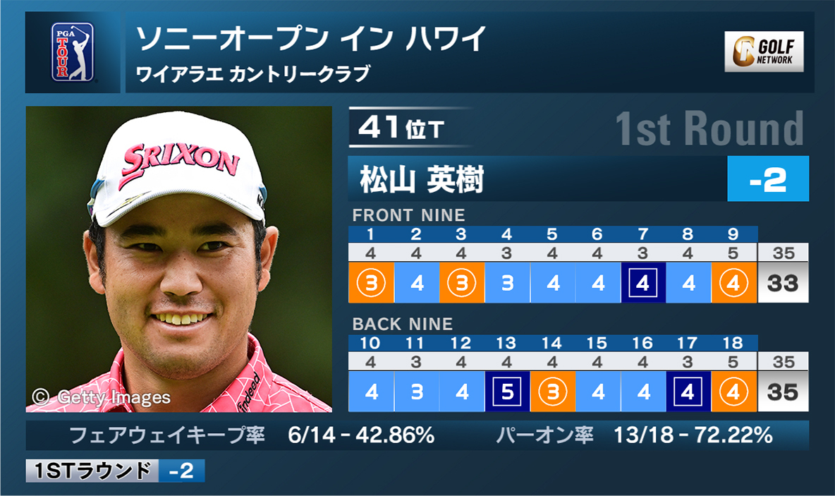 米男子ツアーのソニーオープン イン ハワイは12日、米ハワイ州のワイアラエカントリークラブ(7,044ヤード・パー70)で第1ラウンドが行われたが、日没順延が決定。連覇を狙う松山英樹は5バーディ、3ボギーの「68」で回り、2アンダー暫定41位タイとなった。