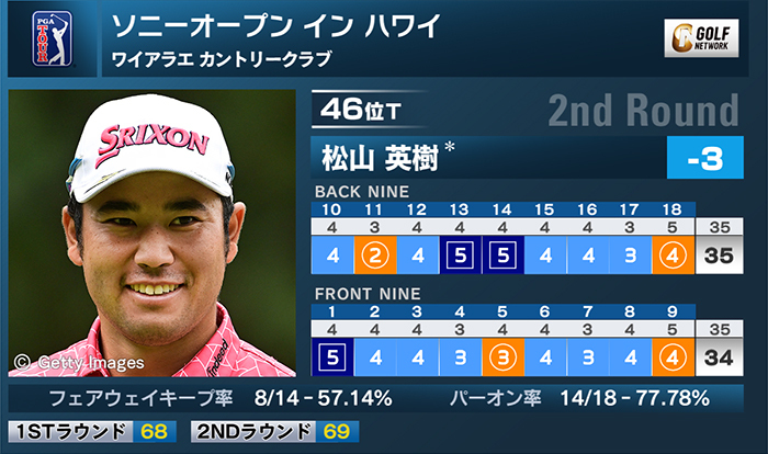 米男子ツアーのソニーオープン イン ハワイは13日、米ハワイ州のワイアラエカントリークラブ(7,044ヤード・パー70)で第2ラウンドが行われたが、2日連続の日没順延が決定。連覇を狙う松山英樹は4バーディ、3ボギーの「69」で回り、通算3アンダー暫定46位タイとなった。