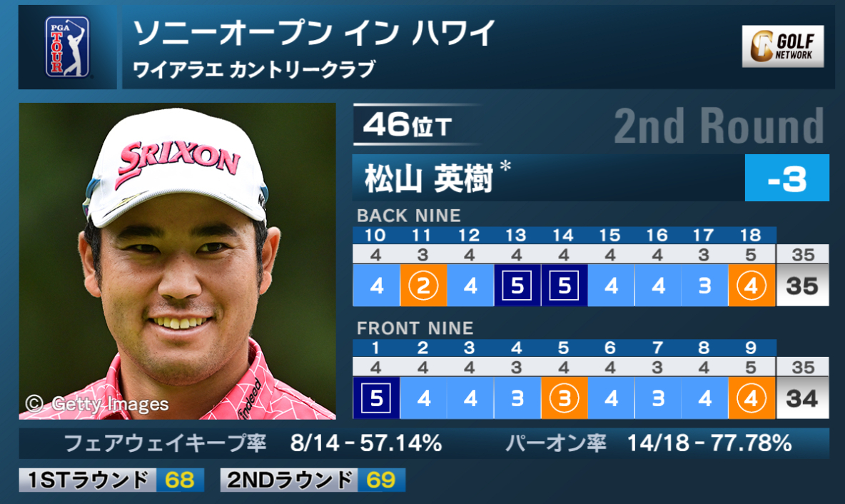 米男子ツアーのソニーオープン イン ハワイは13日、米ハワイ州のワイアラエカントリークラブ(7,044ヤード・パー70)で第2ラウンドが行われたが日没順延が決定。松山英樹は4バーディ、3ボギーの「69」で回り、通算3アンダー暫定46位タイとなった。