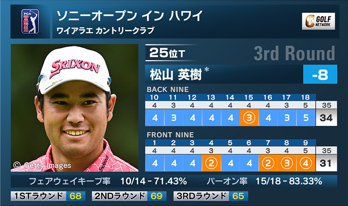 14日、米男子ツアーのソニーオープン イン ハワイ(米ハワイ州/ワイアラエカントリークラブ)は3日目が終了。前回王者の松山英樹は上がり3連続を含む5バーディ、ノーボギーの「65」でプレーし、首位と7打差の通算8アンダー25位タイで最終日を迎える。