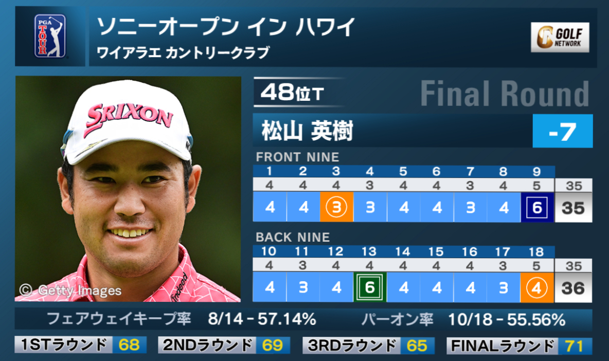 米男子ツアーのソニーオープン イン ハワイは15日、米ハワイ州のワイアラエカントリークラブ(7,044ヤード・パー70)で最終ラウンドが行われ、松山英樹は2バーディ、1ボギー、1ダブルボギーの「71」で回り、通算7アンダー48位タイで終えた。