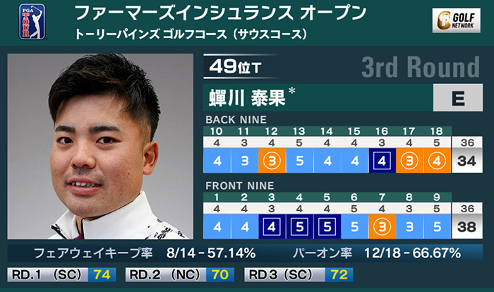 米男子ツアーのファーマーズインシュランスオープンは27日、米カリフォルニア州のトーリーパインズゴルフコース サウスコース(7,765ヤード・パー72)で第3ラウンドが行われ、蟬川泰果は4バーディ、4ボギーの「72」で回り、通算イーブンパー49位タイとなった。