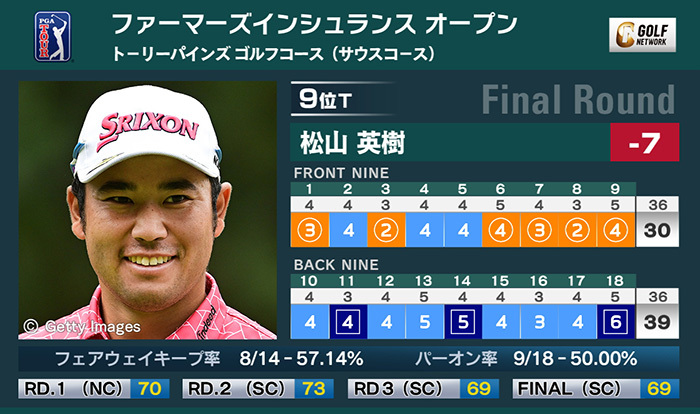 米男子ツアーのファーマーズインシュランスオープンは28日、米カリフォルニア州のトーリーパインズゴルフコース サウスコースで最終ラウンドが終了。15位タイからスタートした松山英樹は3アンダー「69」で回り、通算7アンダー9位タイとなった。