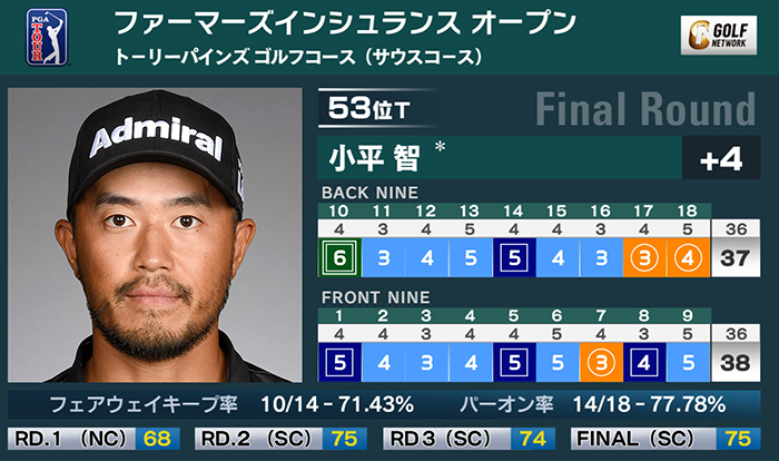 米男子ツアーのファーマーズインシュランスオープンは28日、米カリフォルニア州のトーリーパインズゴルフコース サウスコースで最終ラウンドが終了。小平智は3バーディ、4ボギー、1ダブルボギーの「75」でプレーし、通算4オーバー53位タイで終えた。