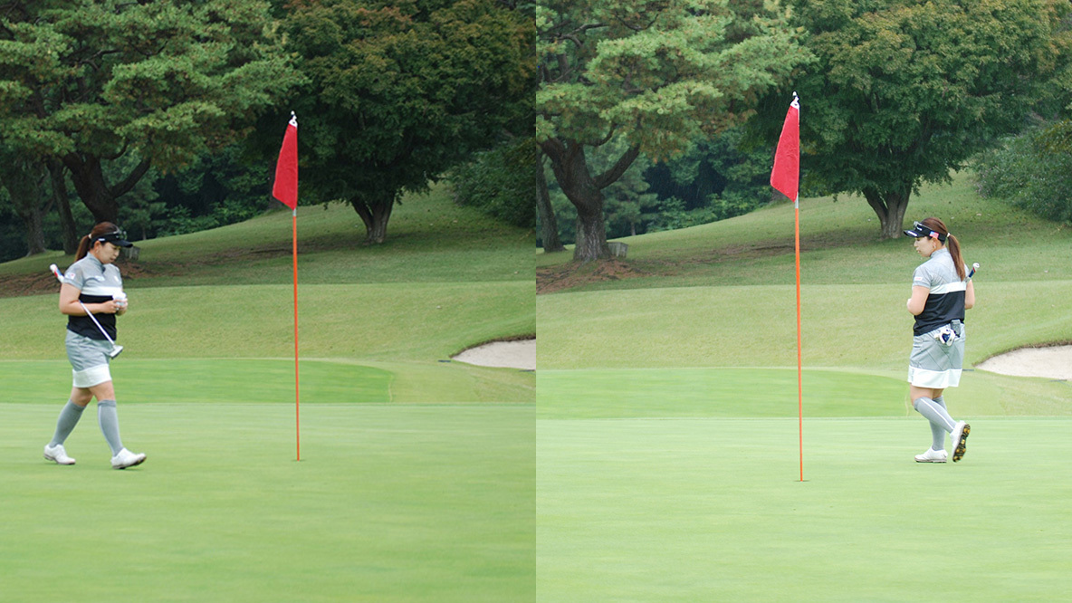 このようなミスを防ぐためにも、他のプレーヤーの邪魔にならないようにしながら、カップ周りをグルッと回ることをオススメします(写真①②)。一方向からではなく、全体を見ることで、上り下りはもちろん傾斜もわかるようになります。ひと呼吸おくという意味でもぜひやってみてください。