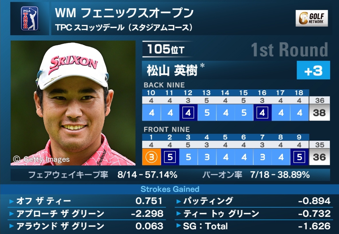 大会2勝の松山英樹は1バーディ、4ボギーの「74」で回り、3オーバー暫定105位タイと出遅れている。