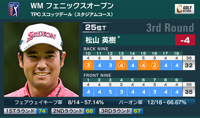 米男子ツアーのWMフェニックスオープンは11日、米アリゾナ州のTPCスコッツデール(7,261ヤード、パー71)でサスペンデッドとなっていた第2ラウンドと第3ラウンドが終了。大会2勝の松山英樹は第2ラウンドを「68」、第3ラウンドを「67」とし、通算4アンダー25位タイで最終日を迎える。