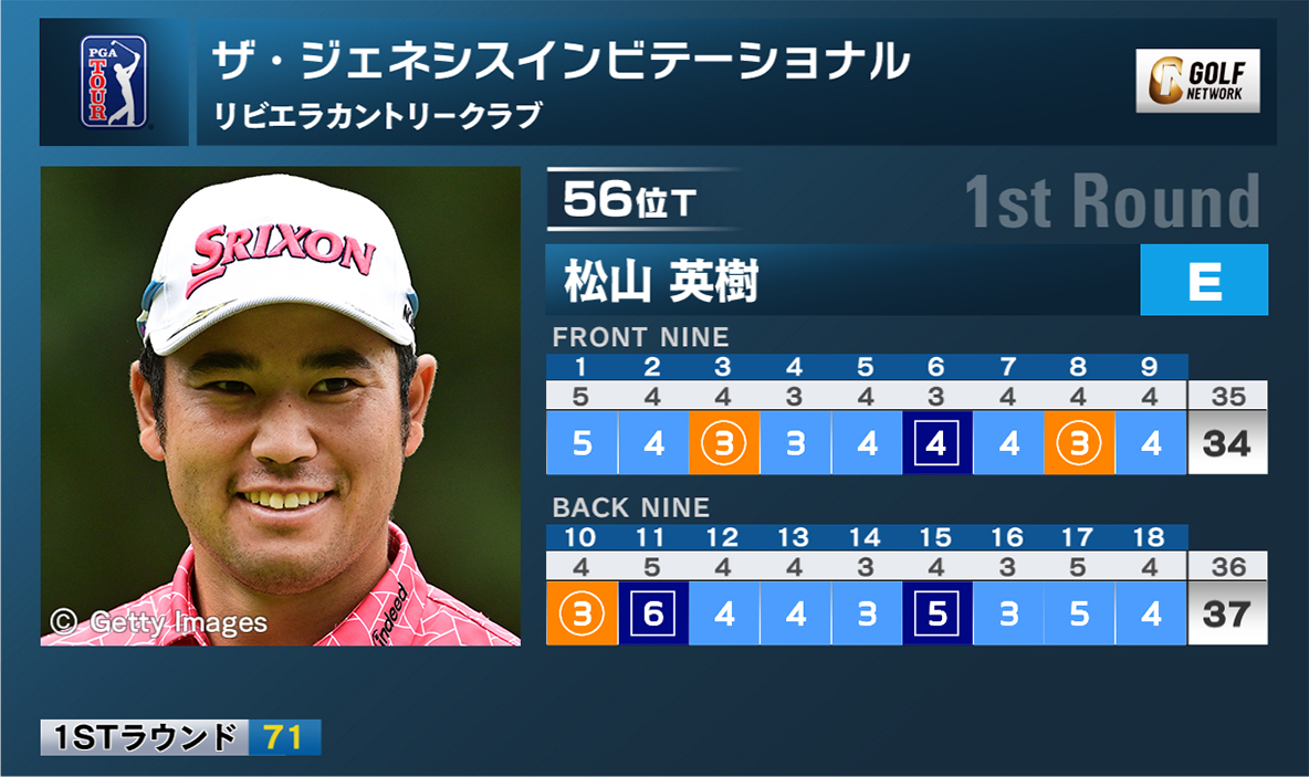 松山英樹は3バーディ、3ボギーの「71」で回り、イーブンパー暫定56位タイとなっている。