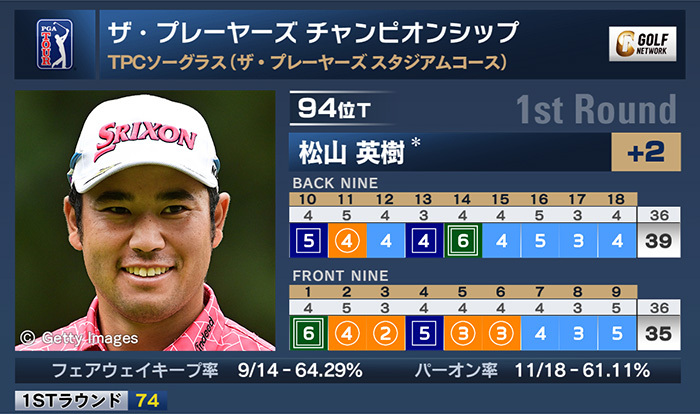 米男子ツアーのザ・プレーヤーズチャンピオンシップは9日、米フロリダ州のTPCソーグラス(7,275ヤード・パー72)で第1ラウンドが行われたが、日没サスペンデッドに。松山英樹は5バーディを奪うも3ボギー、2ダブルボギーと苦しみ、2オーバー「74」で暫定94位タイとなっている。