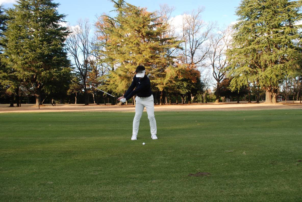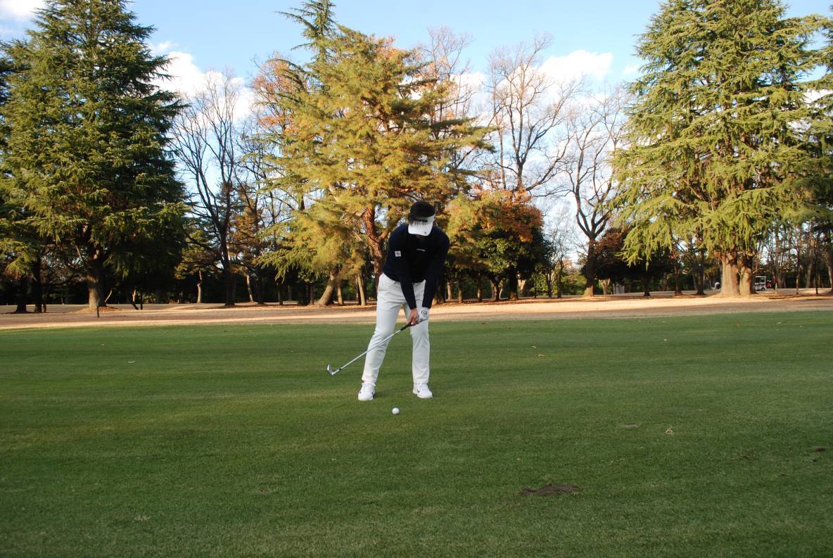 最初はトップ気味のボールになるかもしれませんが、やり続けてください。ハンドファーストで当たるようになれば、テークバックが小さくてもロフトが立って飛距離が出るし、距離のコントロールもしやすくなります。まずは徹底して、この形を覚えてください。