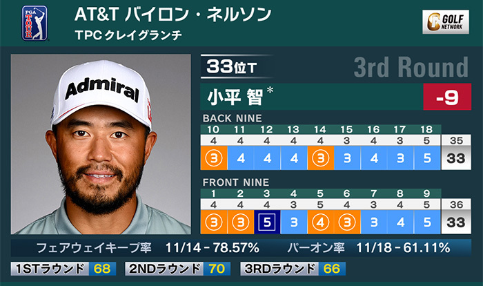米男子ツアーのAT&Tバイロン・ネルソン(13日/米テキサス州/TPCクレイグランチ)は第3ラウンドが行われ、小平智が6バーディ、1ボギーの5アンダー「66」を記録。通算9アンダーまでスコアを伸ばし、65位タイから33位タイに急浮上した。