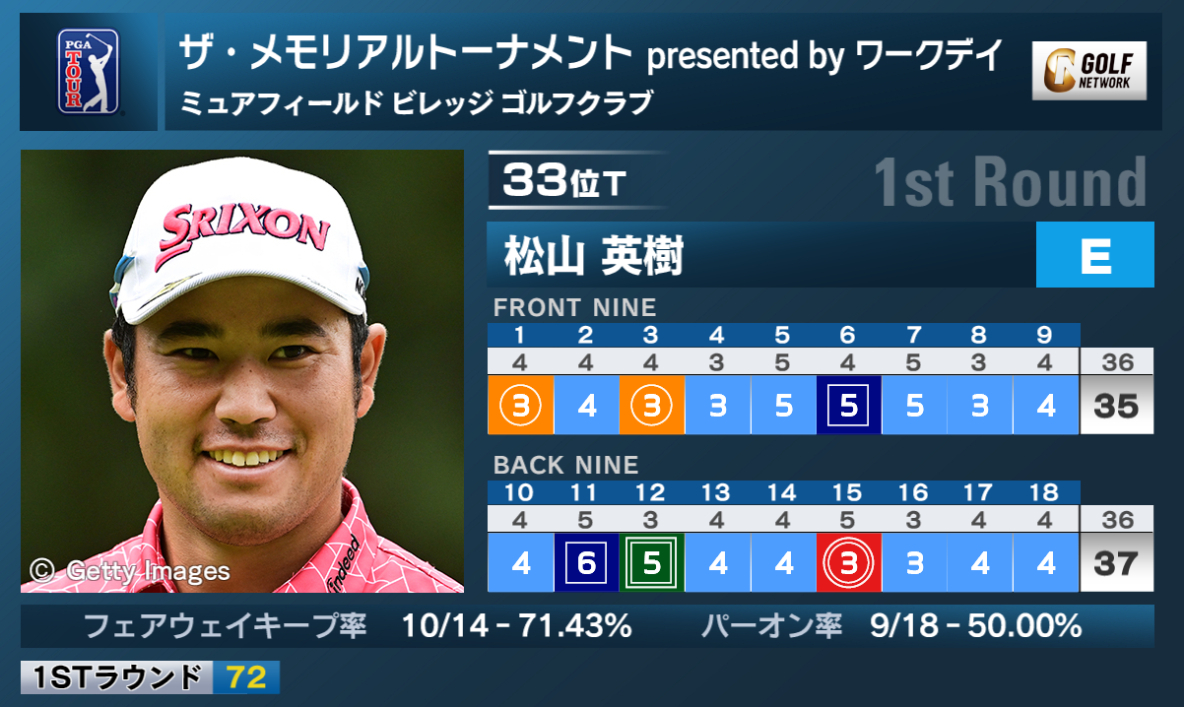 米男子ツアーのザ・メモリアルトーナメント presented by ワークデイは1日、米オハイオ州のミュアフィールドビレッジゴルフクラブ(7,533ヤード・パー72)で第1ラウンドが行われ、松山英樹は1イーグル、2バーディ、2ボギー、1ダブルボギーの「72」で回り、イーブンパー33位タイとなった。