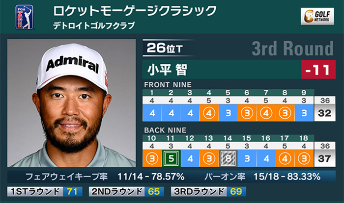 米男子ツアーのロケットモーゲージクラシックは1日、米ミシガン州のデトロイトゴルフクラブ(7,370ヤード・パー72)で第3ラウンドが行われ、19位タイから出た小平智は8バーディ、1ダブルボギー、1トリプルボギーの「69」でプレー。通算11アンダー26位タイで最終日を迎える。