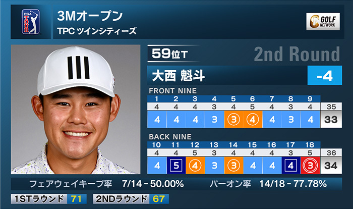 米男子ツアーの3Mオープンは28日、米ミネソタ州のTPCツインシティーズ(7,431ヤード・パー71)で第2ラウンドが行われたが、日没サスペンデッドに。大西魁斗は1イーグル、4バーディ、2ボギーの「67」を記録し、通算4アンダー暫定59位タイとなった。