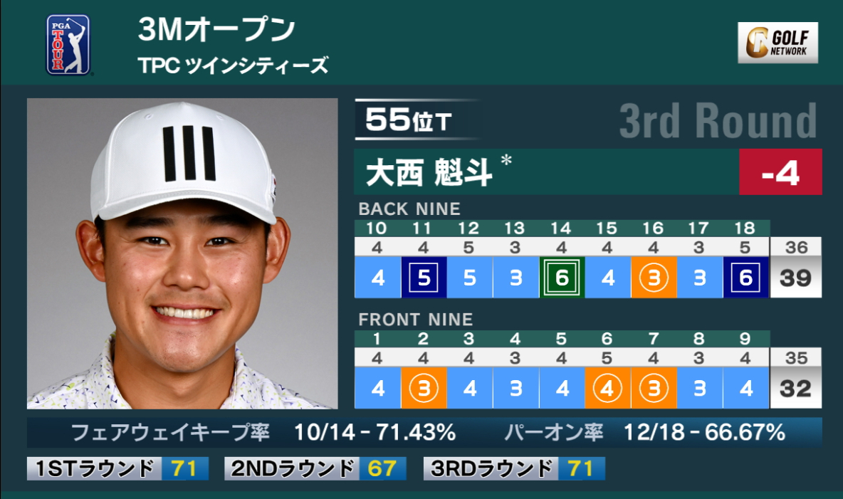 米男子ツアーの3Mオープンは29日、米ミネソタ州のTPCツインシティーズ(7,431ヤード・パー71)で第3ラウンドが行われ、大西魁斗は4バーディ、2ボギー、1ダブルボギーの「71」を記録し、通算4アンダー55位タイとなった。