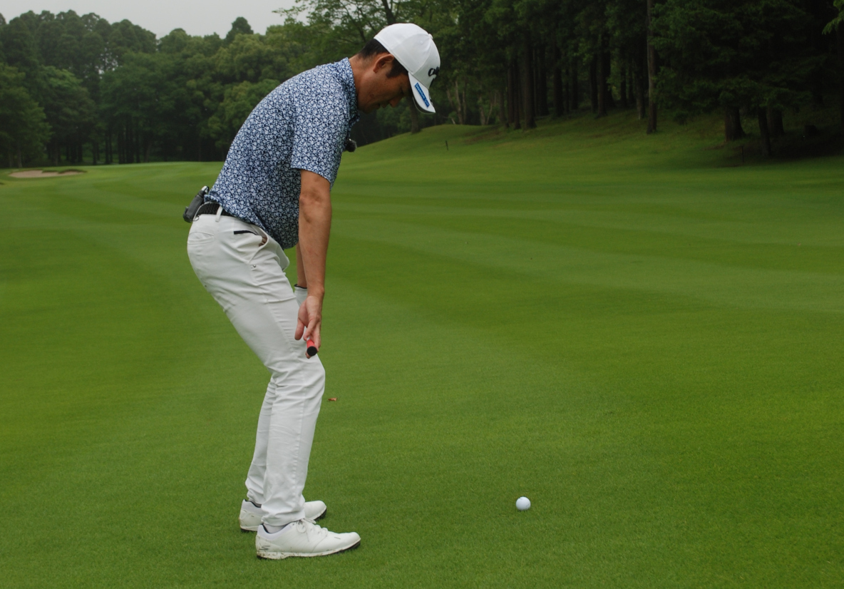 注意点としては、ボールの位置が高くなっている分、クラブも短く持つこと。傾斜が強くなればなるほど短く持つようにしましょう。