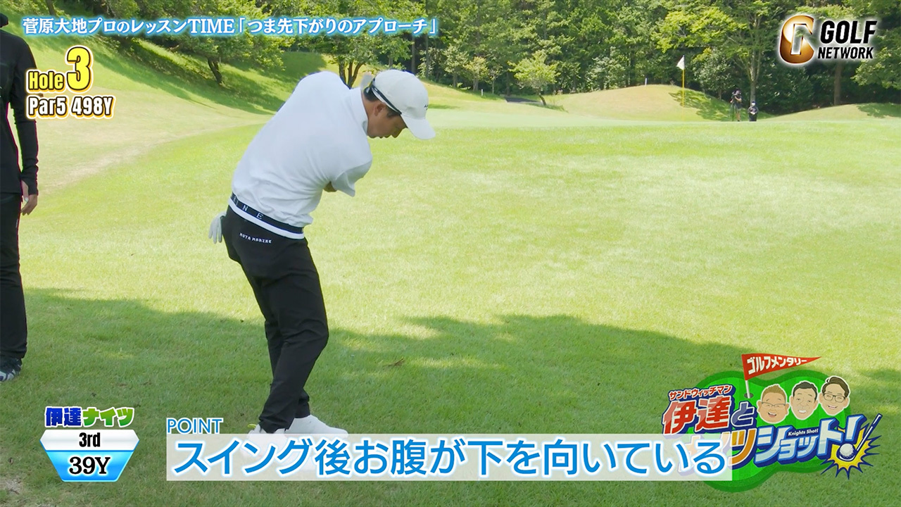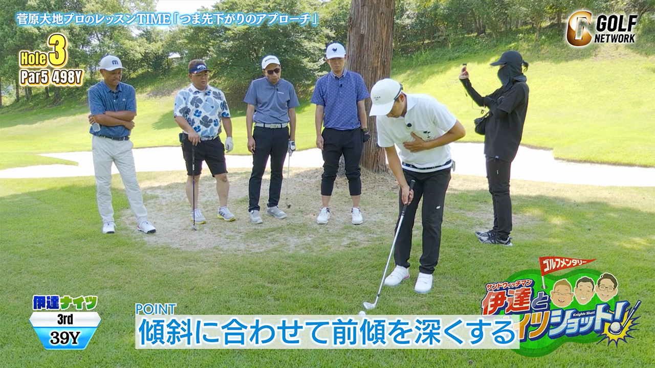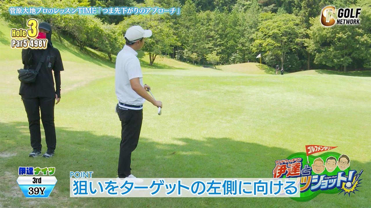 菅原大地レッスンでサンド伊達さんがナイスアプローチ! ツマ先下がりで気をつけたいポイント