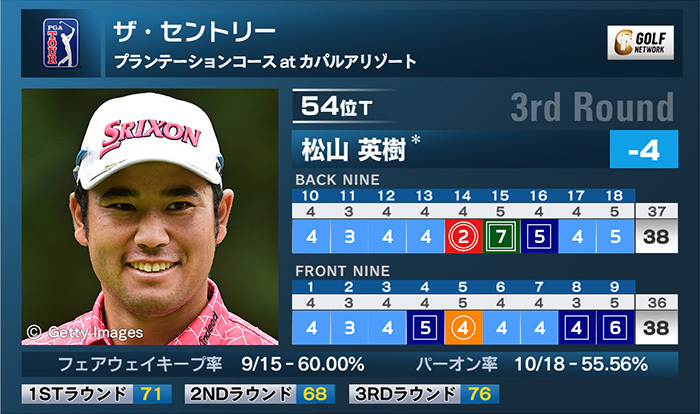 米男子ツアーのザ・セントリーは6日、米ハワイ州のプランテーションコース at カパルアリゾート(7,596ヤード・パー73)で第3ラウンドが終了。松山英樹は46位タイから1イーグル、1バーディ、4ボギー、1ダブルボギーの「76」と落とし、通算4アンダー54位タイで最終日を迎える。