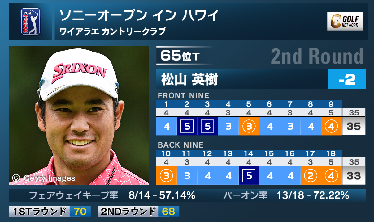 米男子ツアーのソニーオープン イン ハワイは12日、米ハワイ州のワイアラエカントリークラブ(7,044ヤード・パー70)で第2ラウンドが行われ、松山英樹は5バーディ、3ボギーの「68」で回り、通算2アンダー65位タイで予選を通過した。
