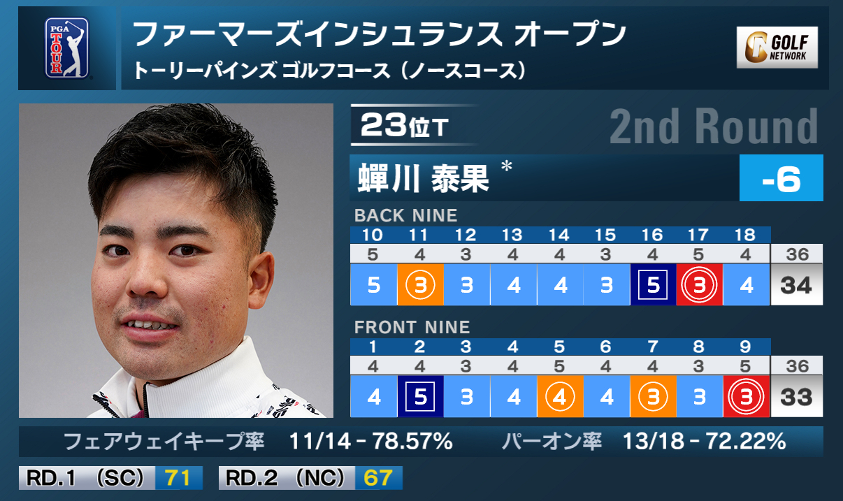 米男子ツアーのファーマーズインシュランスオープンは25日、米カリフォルニア州のトーリーパインズゴルフコースで第2ラウンドが行われ、蝉川泰果はノースコース(7,258ヤード・パー72)で2イーグルを奪うなど「67」を記録し、通算6アンダー23位タイに浮上した。
