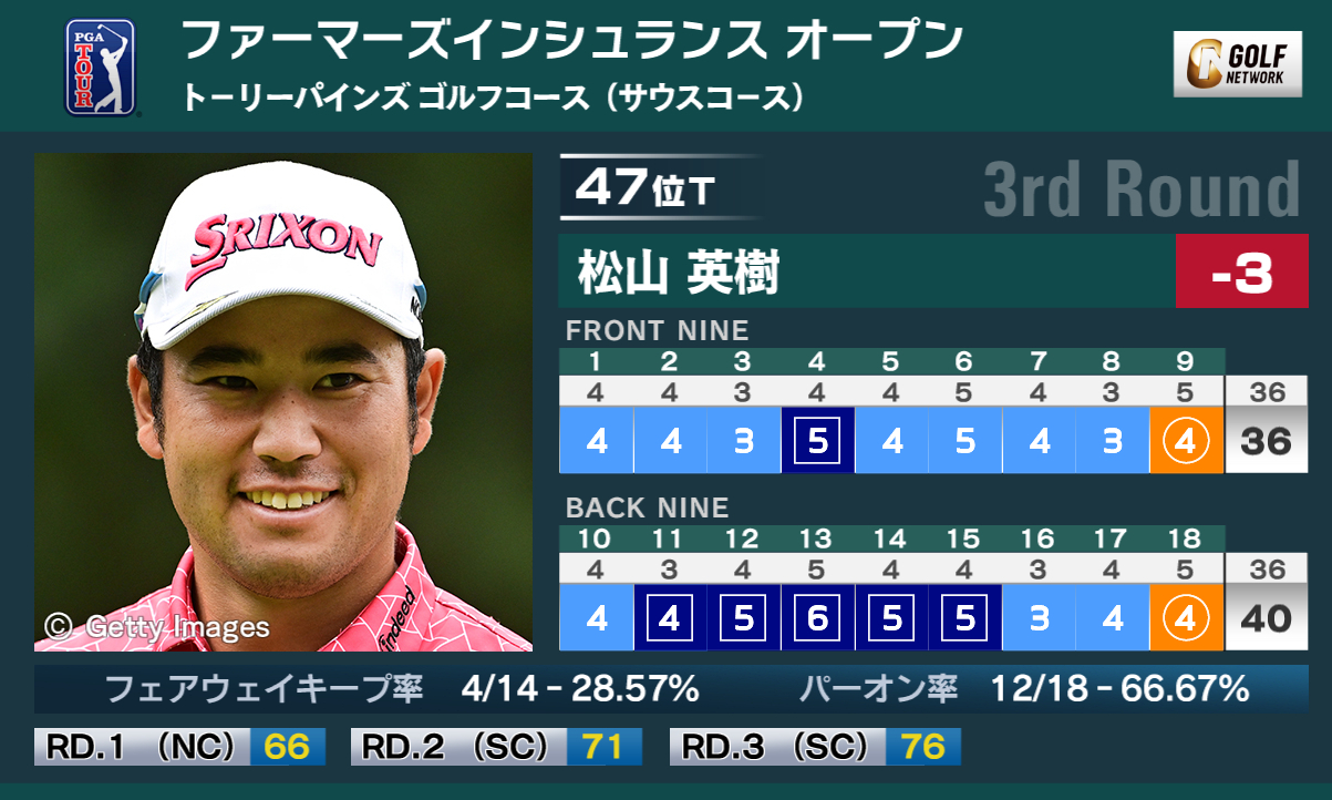 米男子ツアーのファーマーズインシュランスオープンは26日、米カリフォルニア州のトーリーパインズゴルフコース サウスコース(7,765ヤード・パー72)で第3ラウンドが行われ、松山英樹は後半に5連続ボギーを叩くなど「76」と落とし、通算3アンダー47位タイとなった。