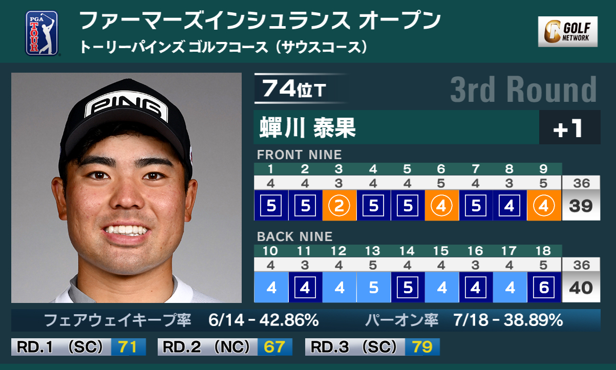 米男子ツアーのファーマーズインシュランスオープンは26日、米カリフォルニア州のトリー・パインズゴルフコース サウスコース(7,765ヤード・パー72)で第3ラウンドが行われ、蝉川泰果は3バーディ、10ボギーの「79」と崩れ、通算1オーバー74位タイとなった。