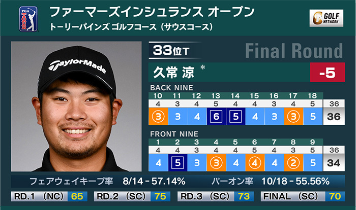米男子ツアーのファーマーズインシュランスオープンは27日、米カリフォルニア州のトリーパインズゴルフコース サウスコース(7,765ヤード・パー72)で最終ラウンドが行われ、久常涼は5バーディ、3ボギーの「70」で回り、通算5アンダー33位タイとなった。