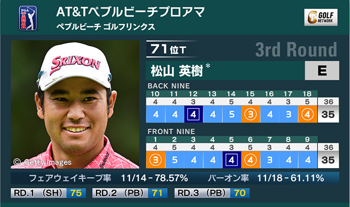 米男子ツアーのAT&Tペブルビーチプロアマは3日、米カリフォルニア州のペブルビーチゴルフリンクス(6,972ヤード・パー72)で第3ラウンドが行われ、松山英樹は4バーディ、2ボギーの「70」で回り、通算イーブンパー71位タイで最終日を迎える。