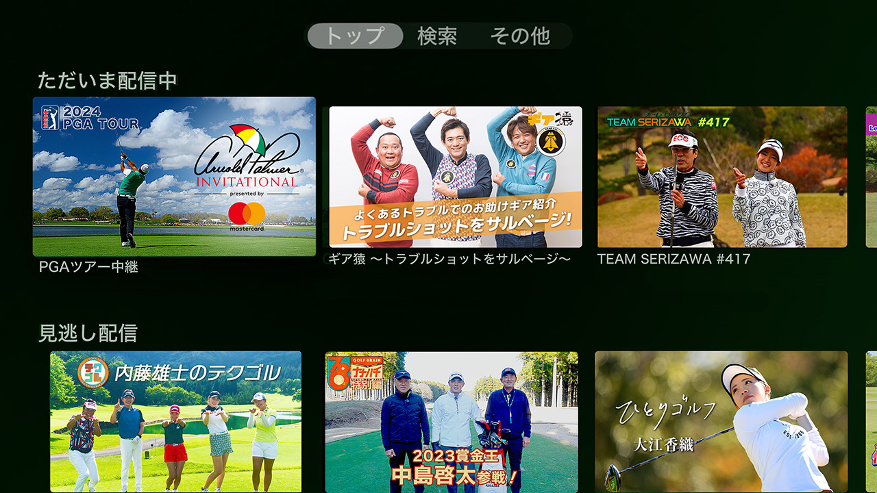 また、「見逃し配信」では、現在配信中の見逃し配信コンテンツが新作から順番にすべて表示され、その配下には現在おすすめしている人気のカテゴリが並び、カテゴリ毎に見逃しコンテンツを探すことも可能です。また、HD画質による高画質な動画再生が可能となり、世界最高レベルのゴルフトーナメントなどを高画質でお楽しみいただくことが可能となります。