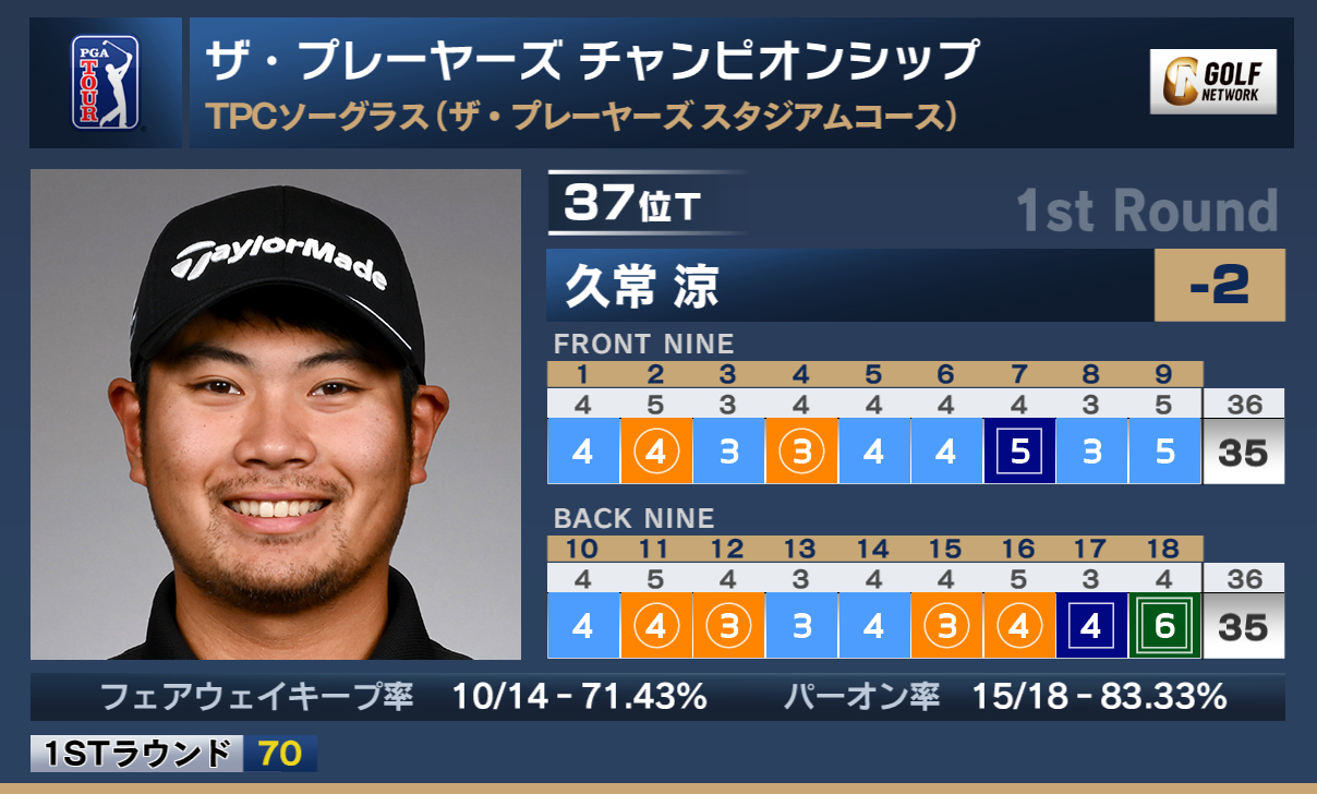 米男子ツアーのザ・プレーヤーズチャンピオンシップは14日、米フロリダ州のTPCソーグラス(7,275ヤード・パー72)で第1ラウンドが行われ、初出場の久常涼は6バーディ、2ボギー、1ダブルボギーの「70」を記録し、2アンダー暫定37位タイ(日没順延)となった。