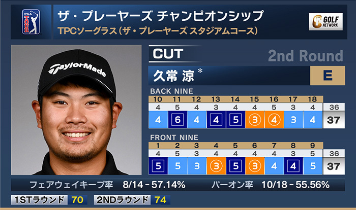 米男子ツアーのザ・プレーヤーズチャンピオンシップは16日、米フロリダ州のTPCソーグラス(7,275ヤード・パー72)で順延となっていた第2ラウンドの残りが行われたが、久常涼は通算イーブンパー74位タイで予選落ちとなった。