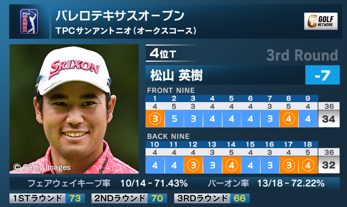 米男子ツアーのバレロテキサスオープンは6日、米テキサス州のTPCサンアントニオ(7,438ヤード・パー72)で第3ラウンドが行われ、松山英樹は6バーディ、ノーボギーの「66」をマークし、首位と8打差の通算7アンダー4位タイに浮上した。
