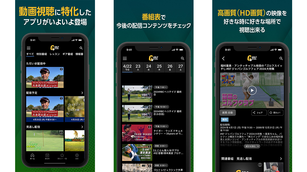 これにより、世界最高峰のゴルフトーナメント「PGAツアー」をはじめ、「海外メジャー大会」や「レッスン・ゴルフバラエティ」など様々なゴルフコンテンツをスマートフォン・タブレット向けアプリで高画質(HD 画質)の映像を好きな時に好きな場所で視聴することが可能となります。