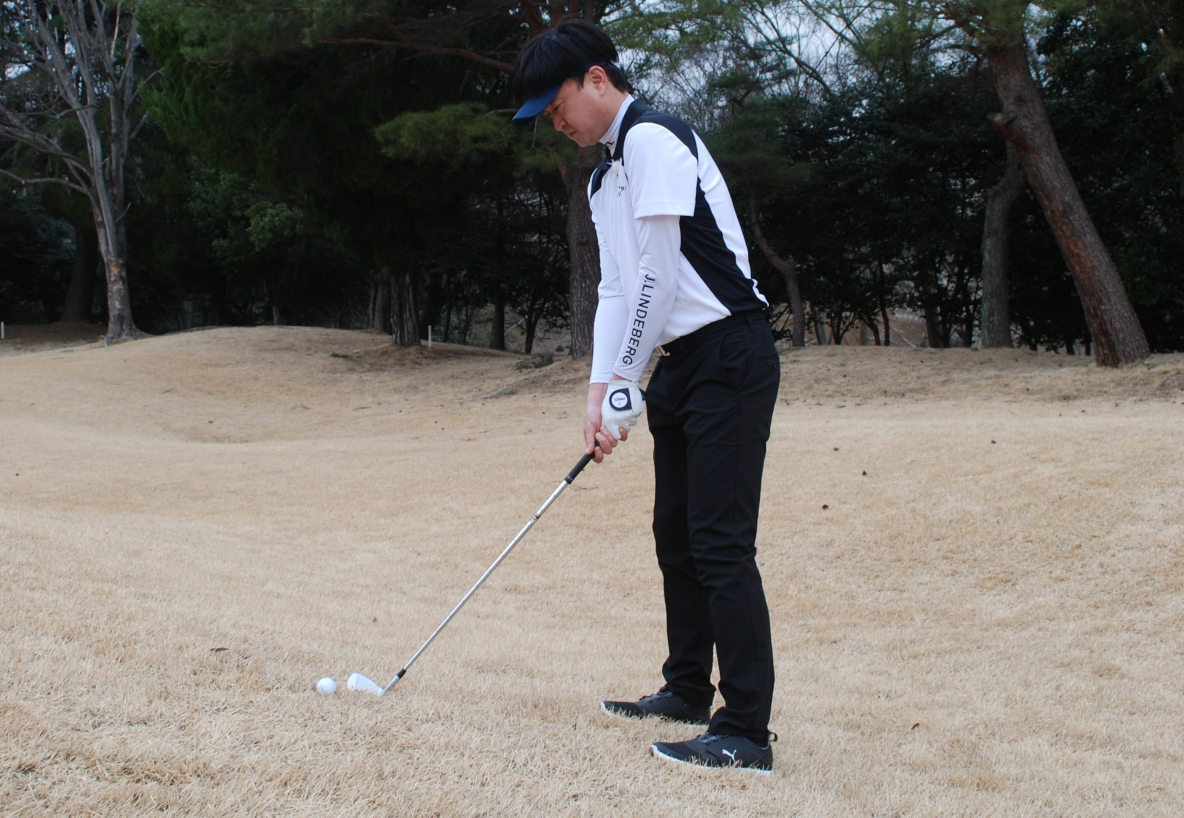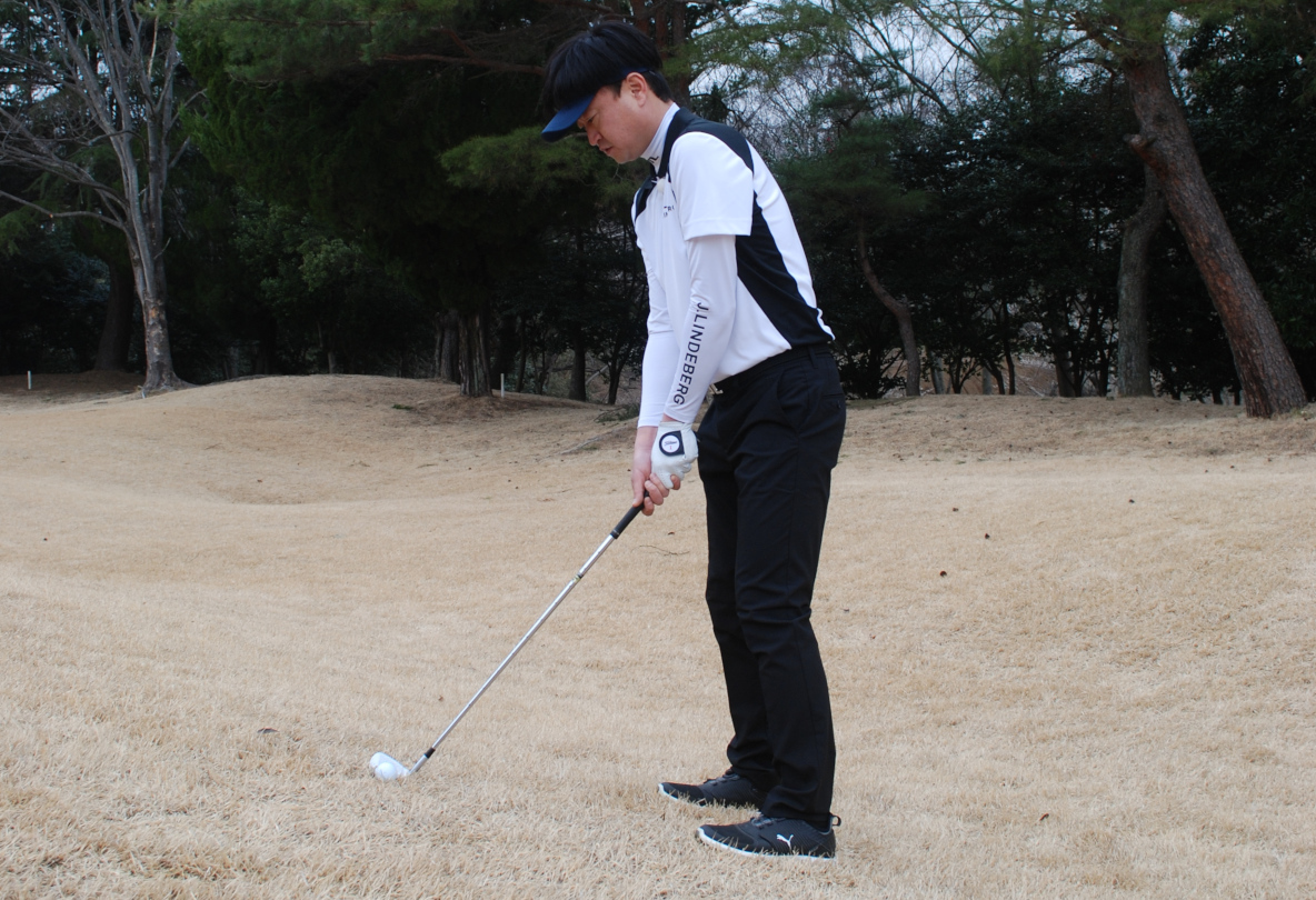 また、ツマ先上がりは、ダフりやすい傾斜でもあります。なので、予めボールを右側に置きましょう。これで、左への引っかけも抑えられます。なお、ボールを右に置いてもダフってしまう人は、前傾を少し起こすというのも一つの方法です。