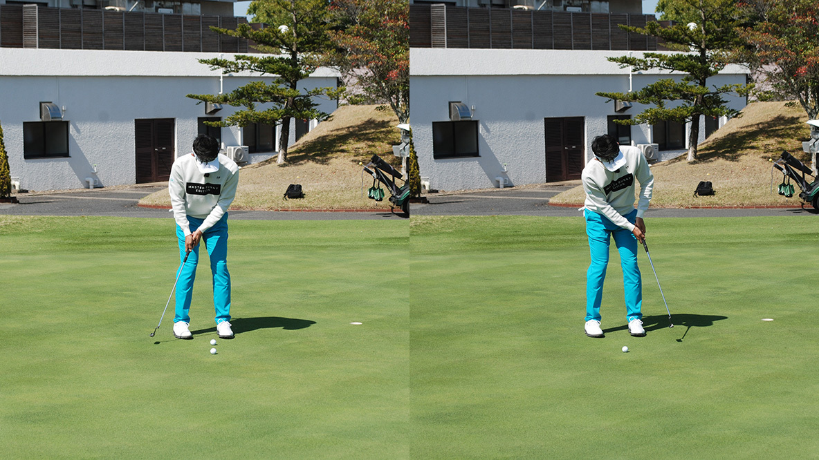 この4つの振り幅に関しては、コースによって変えることはありません。また、アドレスも、1mのショートパットでも10m以上のロングパットでも変えないように心掛けていますし、ボールの位置も、毎回同じところ(僕の場合は真ん中よりも少し左)にしています。