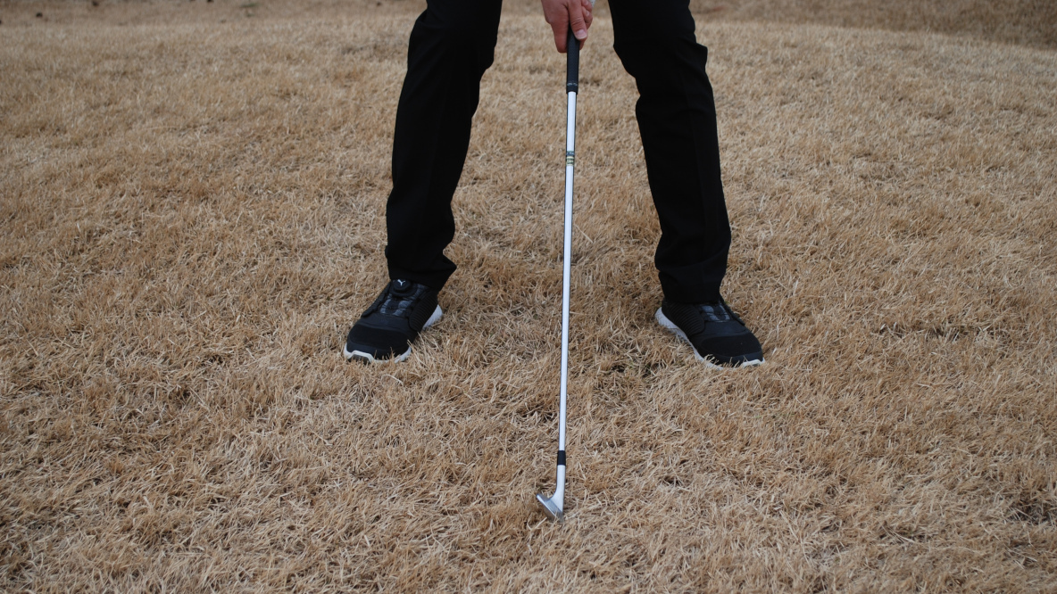 初めに肩幅で構えて素振りをしてみて、ヘッドが地面に届かない場合はスタンス幅を少しずつ広げて素振りをしてみる(同③)。ヘッドが地面に届くまで、このやり方で調整してみてください。そうすれば重心が下がって構えも安定し、トップだけでなく、ほかのミスも防ぐことが出来ます。