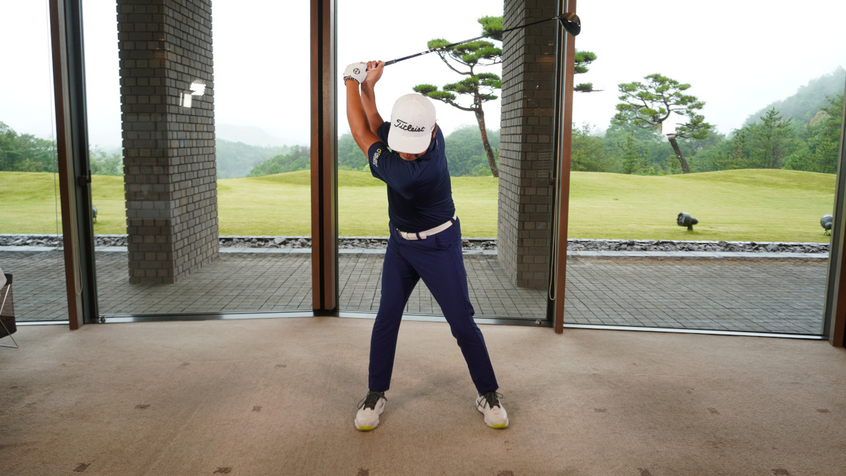 スイングに関しては、肩をしっかり回すことを意識しています(写真③)。僕的にはどこまで肩を回せるかが、飛ばしのポイントになってくると考えています。肩が回らない人は、無理をして回す必要はありませんが、もし今よりも飛ばしたいと思っているのなら、ストレッチなどをして柔軟性を高めてください。