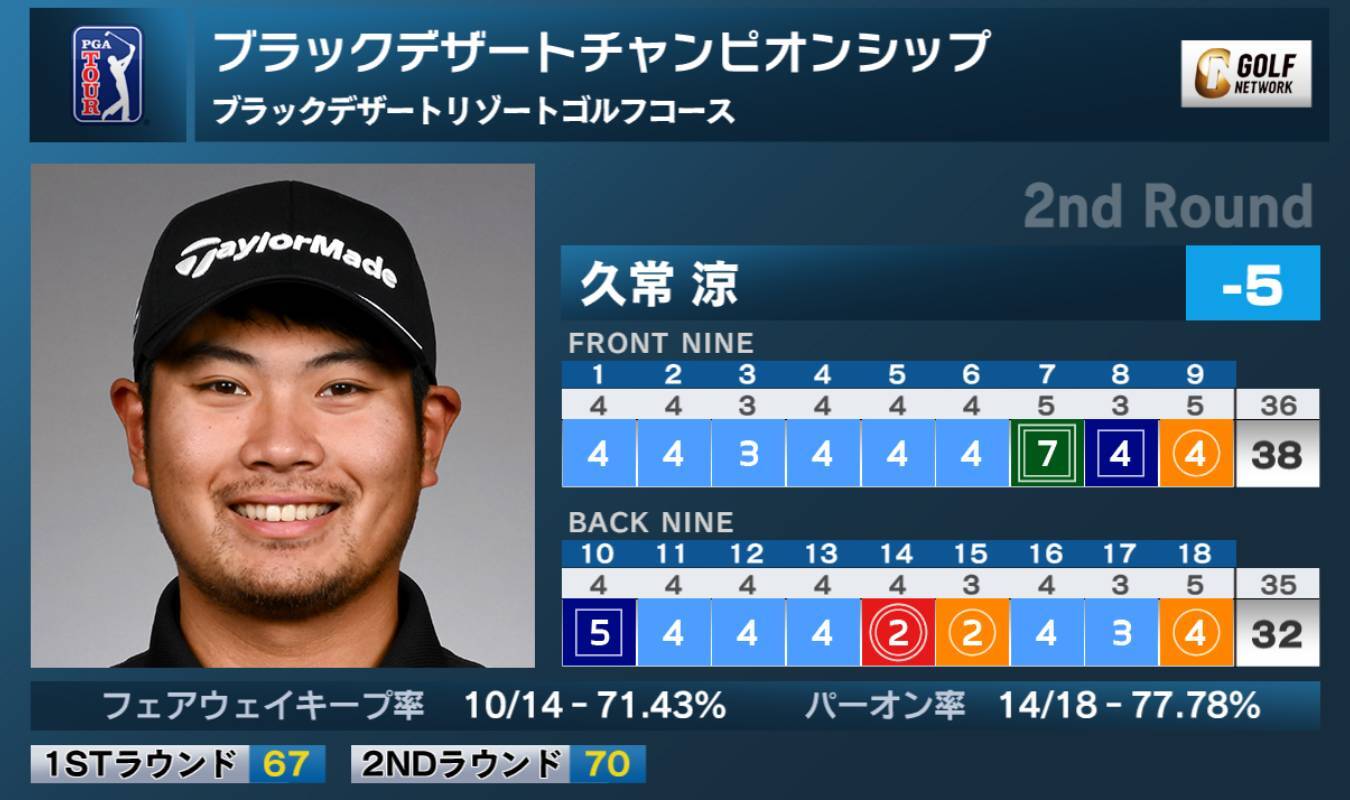 米男子ツアーのブラックデザートチャンピオンシップは11日、米ユタ州のブラックデザートリゾートゴルフコース(7,371ヤード・パー71)で第2ラウンドが行われ、久常涼は1イーグル、3バーディ、2ボギー、1ダブルボギーの「70」で回り、通算5アンダー暫定52位タイ(日没順延)となった。