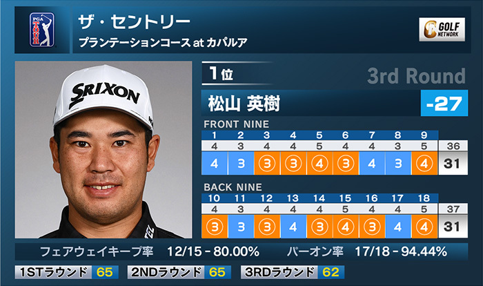 米男子ツアーのザ・セントリーは4日、米ハワイ州のプランテーションコース at カパルア(7,596ヤード・パー73)で第3ラウンドが終了。ツアー通算11勝目を狙う松山英樹がボギーなしの11バーディで「62」をマークし、通算27アンダー単独首位で最終日を迎える。
