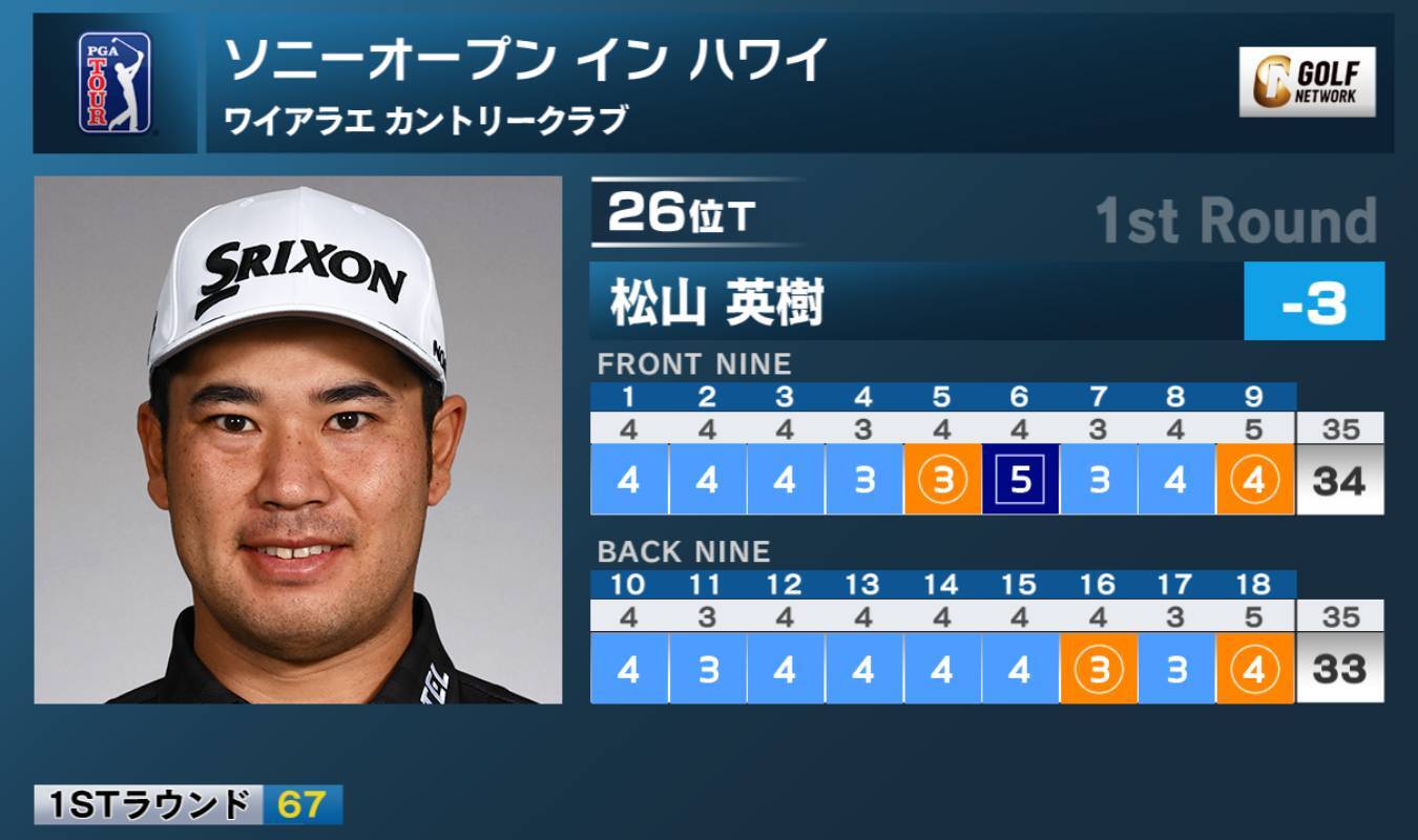 米男子ツアーのソニーオープン イン ハワイは9日、ハワイ州のワイアラエカントリークラブ(7,044ヤード・パー70)で第1ラウンドが行われ、松山英樹は4バーディ、1ボギーの「67」を記録し、3アンダー暫定26位タイ(日没順延)となった。
