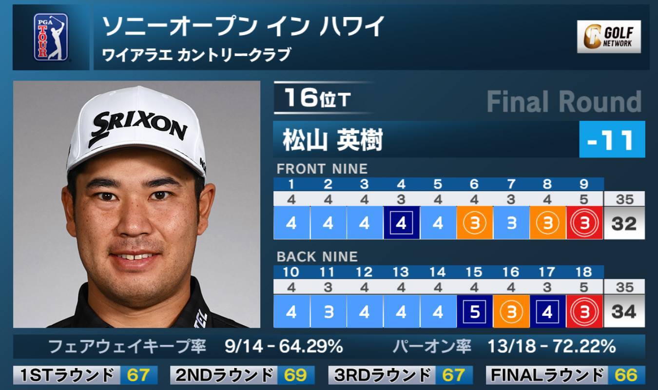 米男子ツアーのソニーオープン イン ハワイは12日、ハワイ州のワイアラエカントリークラブ(7,044ヤード・パー70)で最終ラウンドが行われ、松山英樹は2イーグル、3バーディ、3ボギーの「66」を記録し、通算11アンダー16位タイで大会を終えた。