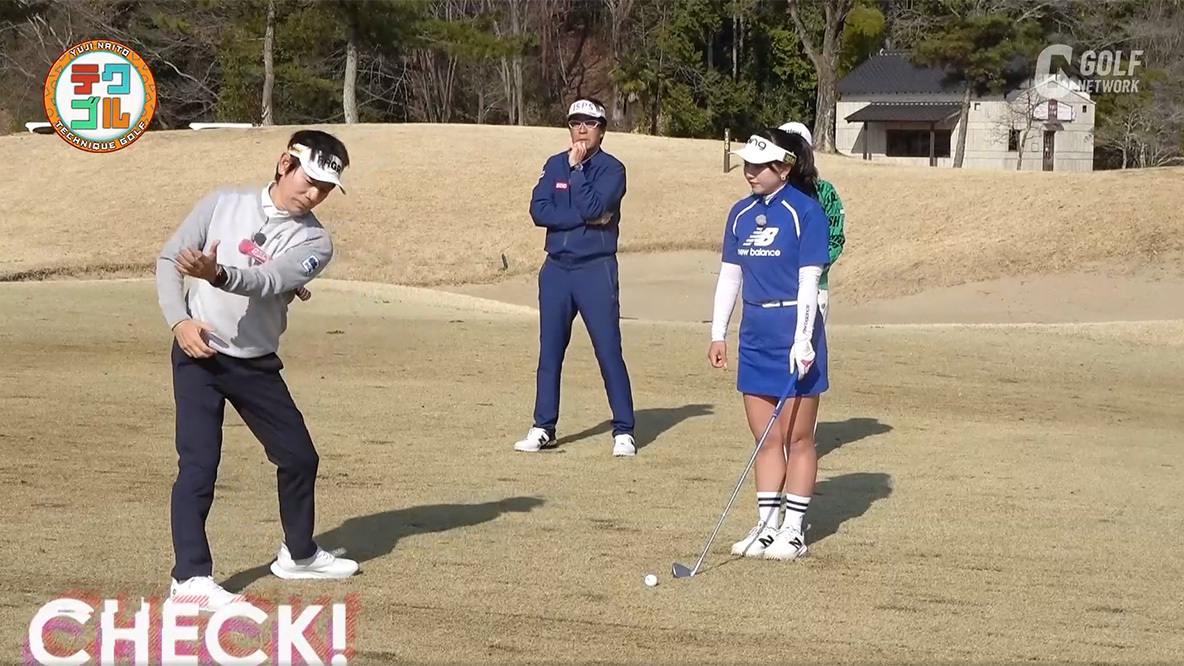 ポイントは、ボールを少し右側に置くこと(同③)。そうすれば自然にヘッドが上から入るので、ライが薄い状況でもクリーンに打っていけます。