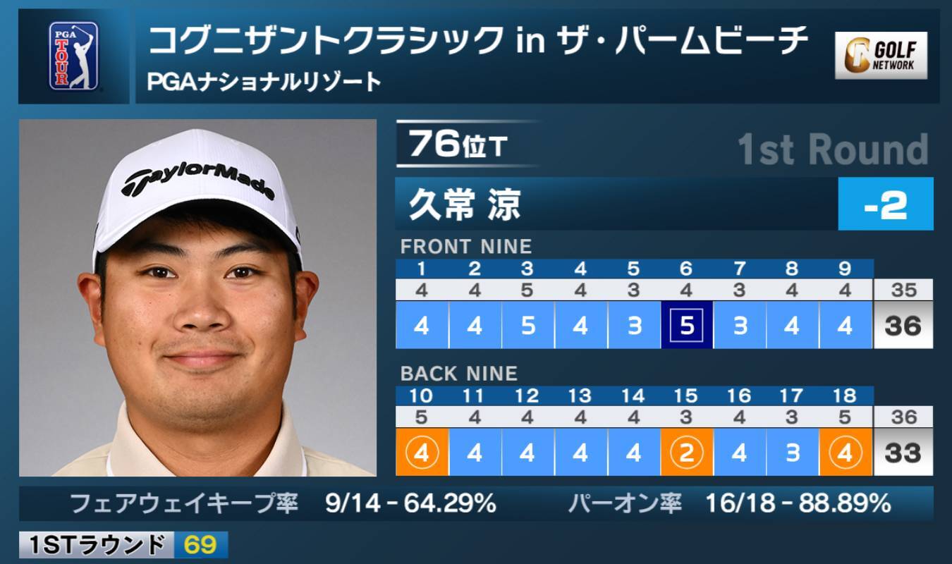 米男子ツアーのコグニザントクラシック in ザ・パームビーチは27日、米フロリダ州のPGAナショナルリゾート(7,167ヤード・パー71)で第1ラウンドが行われ、久常涼は3バーディ、1ボギーの「69」を記録し、2アンダー76位タイとなった。