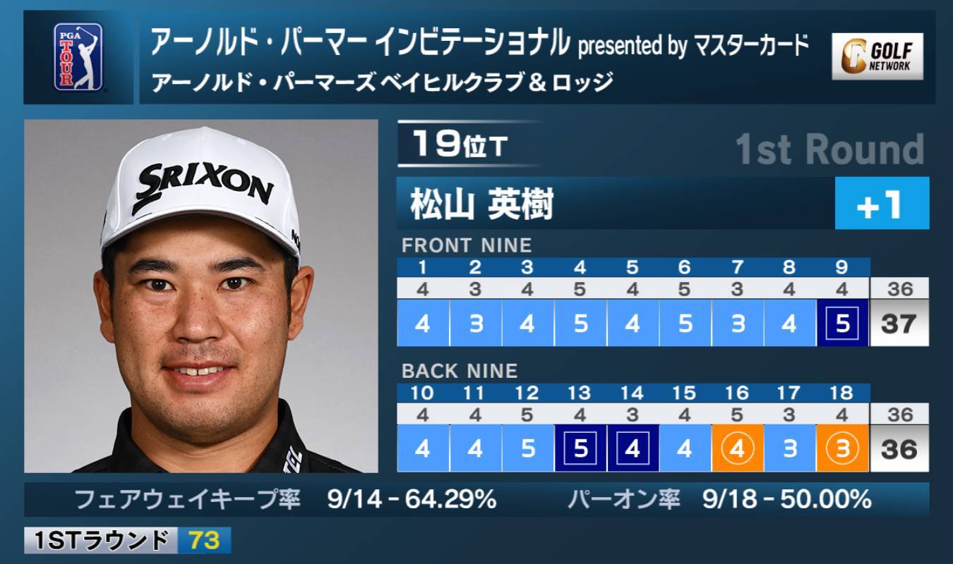 米男子ツアーのアーノルド・パーマーインビテーショナルは6日、米フロリダ州のアーノルド・パーマーズ ベイヒルクラブ&ロッジ(7,466ヤード・パー72)で開幕し、松山英樹は終盤に巻き返して2バーディ、3ボギーの「73」。トップと6打差の1オーバー19位タイで2日目を迎える。