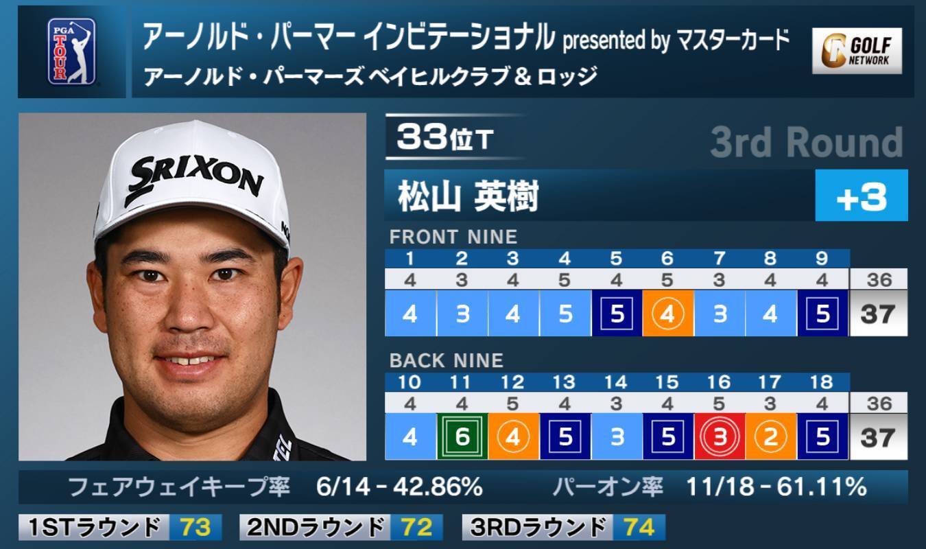 米男子ツアーのアーノルド・パーマーインビテーショナル(米フロリダ州/アーノルド・パーマーズ ベイヒルクラブ&ロッジ)は8日に3日目の競技が行われ、松山英樹は1イーグル、3バーディ、5ボギー、1ダブルボギーの2オーバー「74」。通算3オーバー33位タイで最終日を迎える。